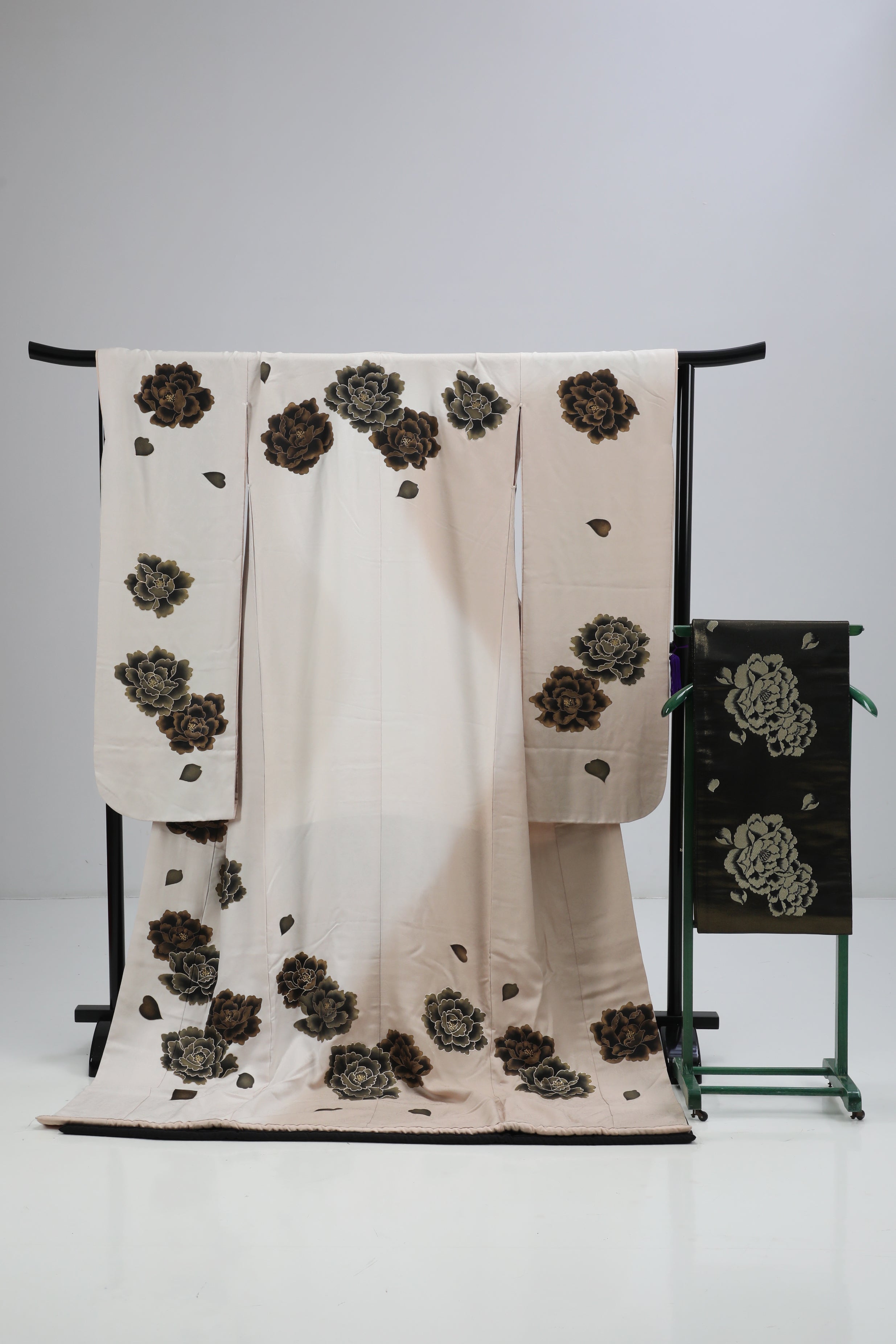 こちらは婚礼用の振袖『引き振袖』です。江戸中期より上流階級の婚礼衣装として着用されるようになりました。大きな牡丹の花がちりばめられた引き振袖。